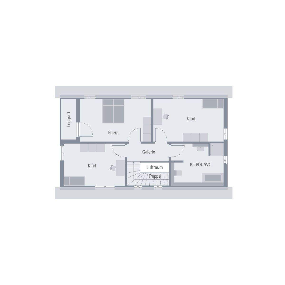 So präsentiert sich unser Design 2. Durch die geräumige Diele im Erdgeschoss gelangen Sie in den kombinierten Koch-Wohn-Ess-Bereich mit Zugang zu einer überdachten Terrasse. Ein Gäste-WC sowie ein Hauswirtschaftsraum ergänzen das Raumangebot. Im Obergeschoss befindet sich das 16 m² große Elternschlafzimmer, aus dem Sie Zugang zu einer Loggia haben, auf der Sie die Zeit im Freien genießen können. Auch die beiden Kinderzimmer bieten eine Menge Platz zum Toben, Spielen und Schlafen.